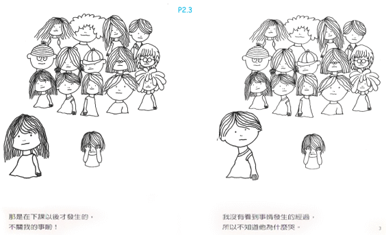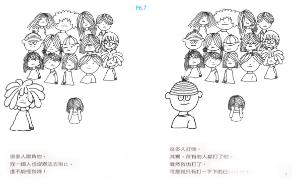 繪圖者以極簡的線條勾畫出一個孩子們的小群體,文字作者則用了一個羅生門式的手法,讓群體裡的孩子一一站出來表白,有的說沒看見誰打人、有的說因為害怕不敢幫忙、有的說只是輕輕打一下而已、有的說是別人先打的、有的說「他很古怪」所以活該挨打……,各種理由加總起來,就是「這不是我的錯」、「這不關我的事」。
