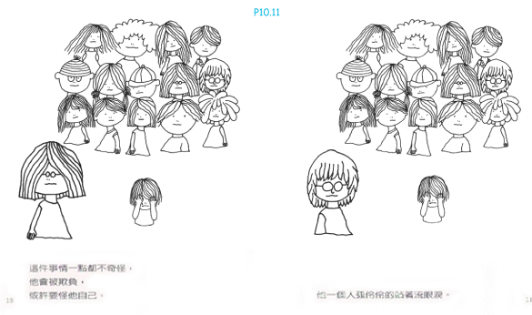 這本書前十六頁講的是孩子的世界裡常有的摩擦,一名體型弱小的孩子被人欺負了,蒙著臉哭泣,誰欺負了他呢?