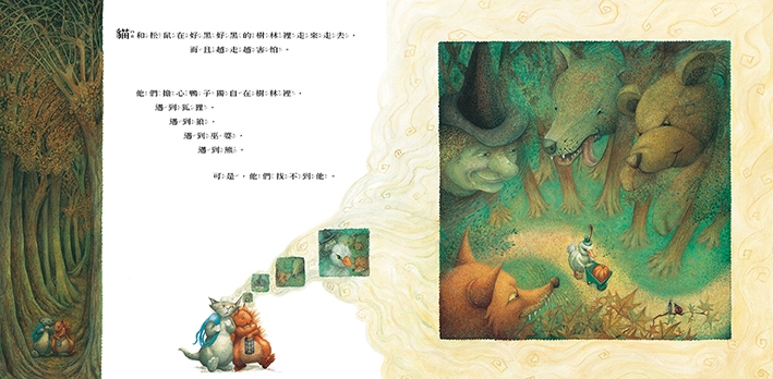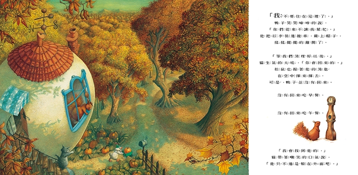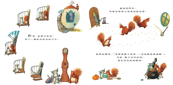在翻開書的那一剎那,扉頁的金黃色調就使我們感受到南瓜湯溢出的暖暖氣息,聞到了食物的味道。接下來的弧線造型讓人問道:這聲音是打哪兒來的?樂聲引著我們看到暗綠樹林中,白色小屋裡金黃的燈光,和其間三個角色合作創造音樂和美湯的生活。鏡頭從屋外拉到了窗邊,繼而進入室內,對準三個角色做近距離的拍攝。鏡頭的變化使讀者的心緒跟著情節之起伏而收縮或放鬆。之後,作者相當自如地運用跨越兩頁和在同一頁裡呈現諸多小畫面的技巧,展現角色在時間的流動中,焦躁、不安、懼怕與擔憂的情感與思緒。圖與文字各自佔據的空間造型與變化,也在作者的高明安排下,恰如其分地表達情節和角色的感受。例如,作者運用左邊的長條圖形表達貓與松鼠在林子裡尋覓鴨子的幽深心情,在旁邊的白色畫面裡,貓和松鼠的想法藉著一個個漸漸變大的畫面和其上的文字表達出來,緊臨的右邊一整頁,形式上是左邊小畫面的延伸,內容則是這兩個角色之擔憂的高點。內容與形式的巧妙契合與文圖互動創造出的節奏,令人讚嘆不已。