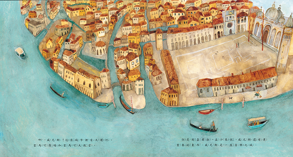 以音樂、歌劇立都的義大利威尼斯為背景,創作出詮釋音樂之美的圖畫書,從生活點滴、看到的、聽到的作為藝術創作的題材,對藝術的欣賞與創作有很大的啟發。