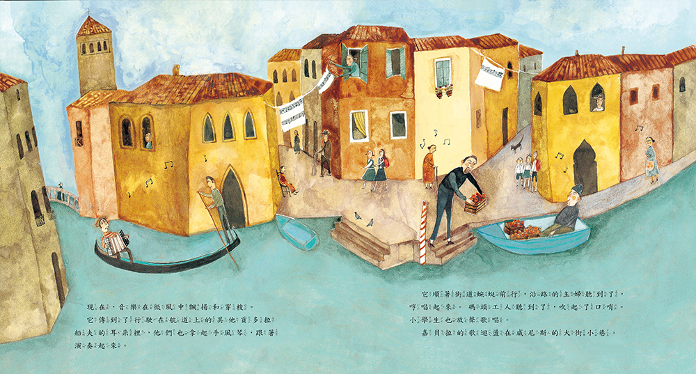 故事中的主角是個小女孩嘉貝拉,她覺得威尼斯很棒,有聖馬可廣場、有運河有、大教堂,而更棒的是到處都可以聽到音樂。從市場回家的路上,聽到各種攤販的叫賣聲、鴿子拍翅牓的聲音、鐘聲,還有遠處傳來甜蜜的媽媽呼喚聲,在嘉貝拉心裡融合成一首美麗的歌。順口哼起這首歌,音樂就這麼隨著微風飄送,這旋律在大街小巷彎來繞去,大家跟著哼起來,嘉貝拉的歌就這麼飛揚在威尼斯的每個角落……。文字清新如詩如歌,繪圖者是美國知名童書畫家,用壓克力顏料的技法,畫風獨創一格,看似樸拙、稚氣,但韻味十足,把威尼斯的味道感覺都畫出來。