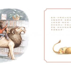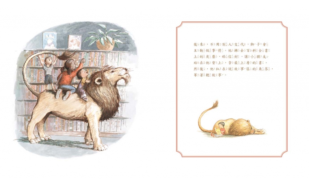故事可能迷人,但是和大家一起聽故事、一起在圖書館裡過日子,或許才是獅子最想念的情懷與滋味吧。整本書的淡雅色調和作者描繪情感的方式一樣安靜,不太有情緒的敘述對照趣味十足、表情細膩的畫面,更讓人對細節印象深刻。像是孩子或騎或坐在獅子身上時,獅子臉上全然滿足的神情。這樣的神情說服我們:閱讀是一件在空間裡和人、和書發生情感的美事,就像圖書館的那頭獅子所感受到的一樣。
