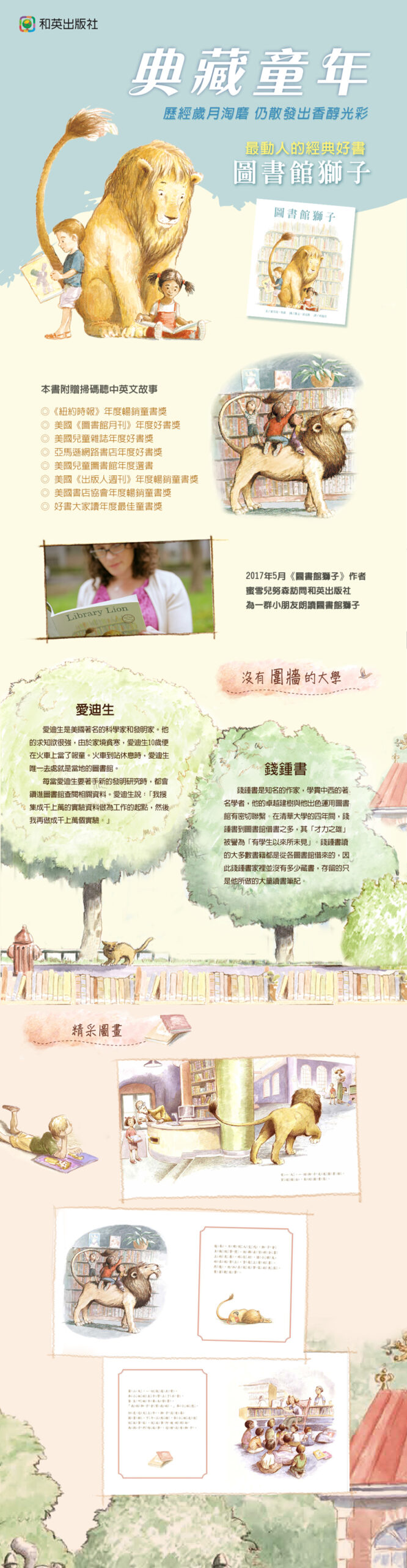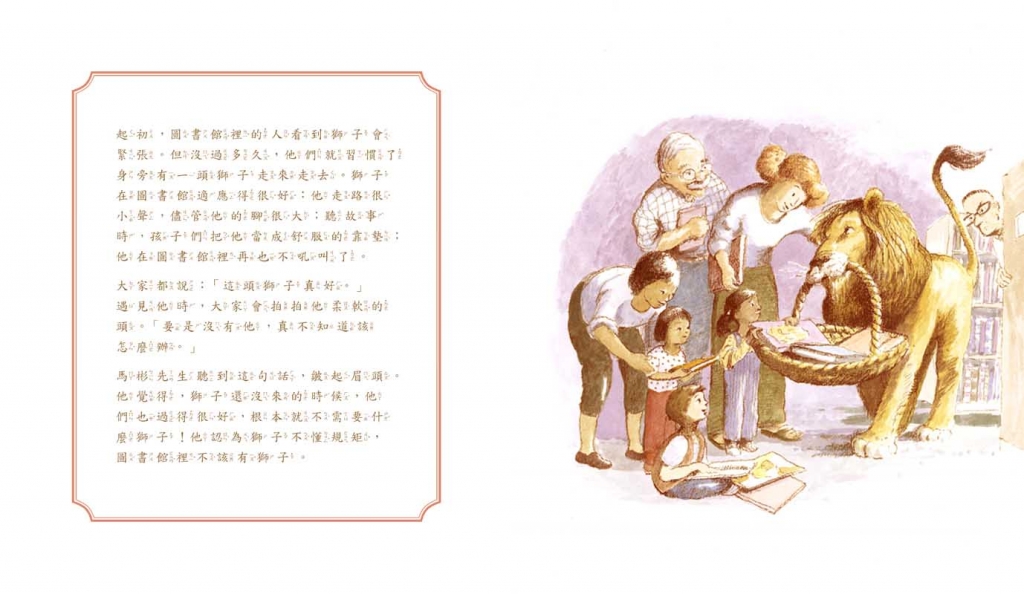 這個故事一開頭就引人入勝成功刻劃出人與獅子感人的情誼。美麗生動的圖畫,很能吸引小讀者的閱讀興趣。獅子的遭遇更讓小朋友感同身受,因為他們也是如此渴望親近圖書館,卻又擔心觸犯規定。