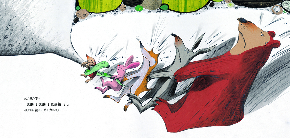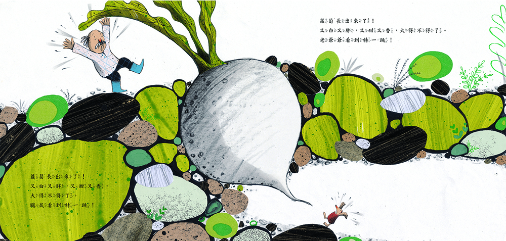 這是俄國著名童話《拔蘿蔔》的改寫本。由國內作家和畫家林世仁與陳致元合作,呈現出一本充滿動感、幽默又有節奏感的大版本圖畫書。設計優美的跨頁圖畫,除了具立體感的大蘿蔔成為讀者視線的焦點外,地面上和地底下的大拔河比賽,精彩得連讀者也忍不住為他們加油,是一本值得推薦的優良本土創作圖畫書。