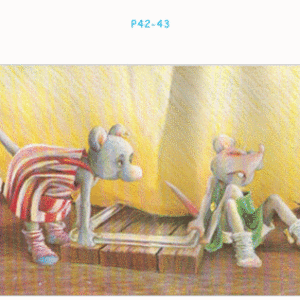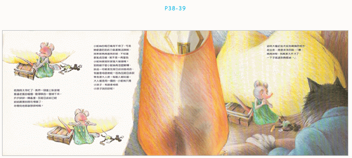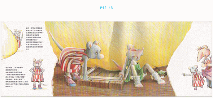 翻開書冊第一面,四口之家住在沙發夾層中,巧妙地勾引起讀者的好奇,怎樣的一家子?沙發皮微微掀起,半遮半掩,故事發生在不受注意的檯面下、角落處、夾縫中,這當然是個精心設計的隱喻。第二面特寫沙發夾層,主角在小洞後和我們打招呼,原來是老鼠!