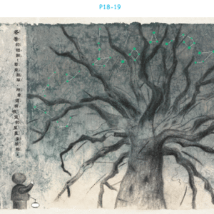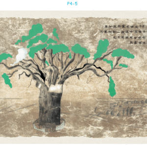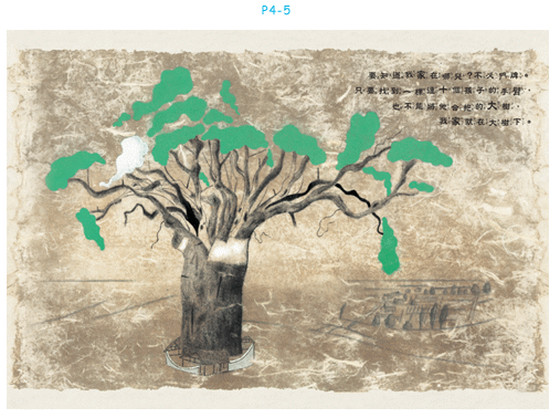 描繪家樹的歷史。圖畫借鑒了古前壁畫的樸拙稚趣筆法,