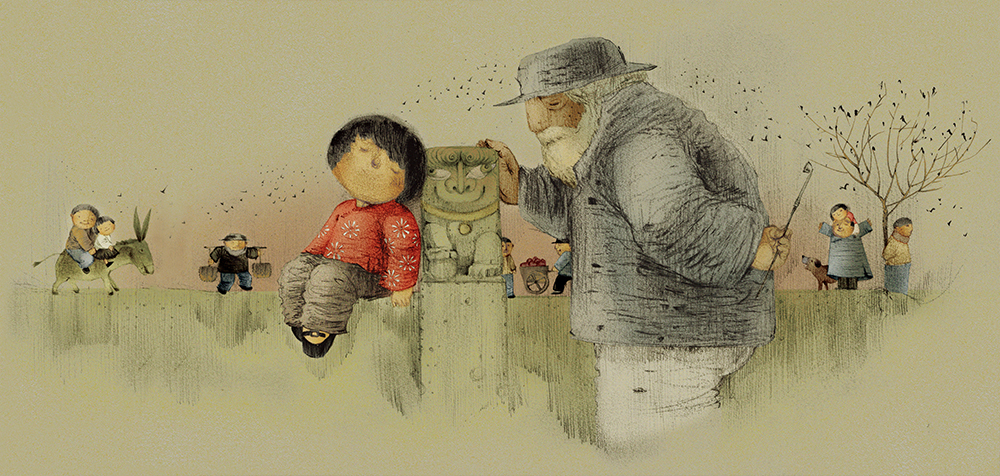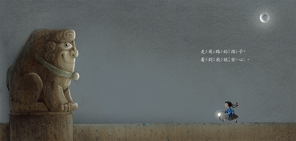 小石獅個頭不大,年紀卻老;過年的時候,大家奉上飯菜,宛如把小石獅當成生活中的一種必然存在。這不就是守護的意義嗎?小石獅定置在某處,知道每個人生活中發生了什麼,看著小鎮的人在空間和時間中不斷移動,然後安安穩穩地成為人們記憶的著根之處。永遠處在變動狀態中的人們,或許都需要一個知道自己的過往又永遠接納的小石獅。小石獅的自述,或許可以讀成每個人內心深處極為重要的想像。一個詩句一個畫面的敘說,由於文字的蘊含和圖像的時空層次,意外地使人的閱讀速度減緩,安靜地領略「守護」既豐盛又深情的意涵,閉目回想書中難忘的畫面,低迴不已。