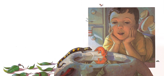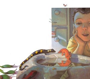 作者貼近孩童的心靈,以溫暖的情懷和優美的想像,撘配繪者輕柔筆觸勾勒出的繽紛場景,在如夢似幻的基調中,小男孩所傾訴的不僅是對小蠑螈的呵護關懷,同時娓娓道出了自身的需求與嚮往—是的,孩子需要細膩的照顧、自由的玩耍、友誼的滋潤、以及投身在大自然的懷抱裡。