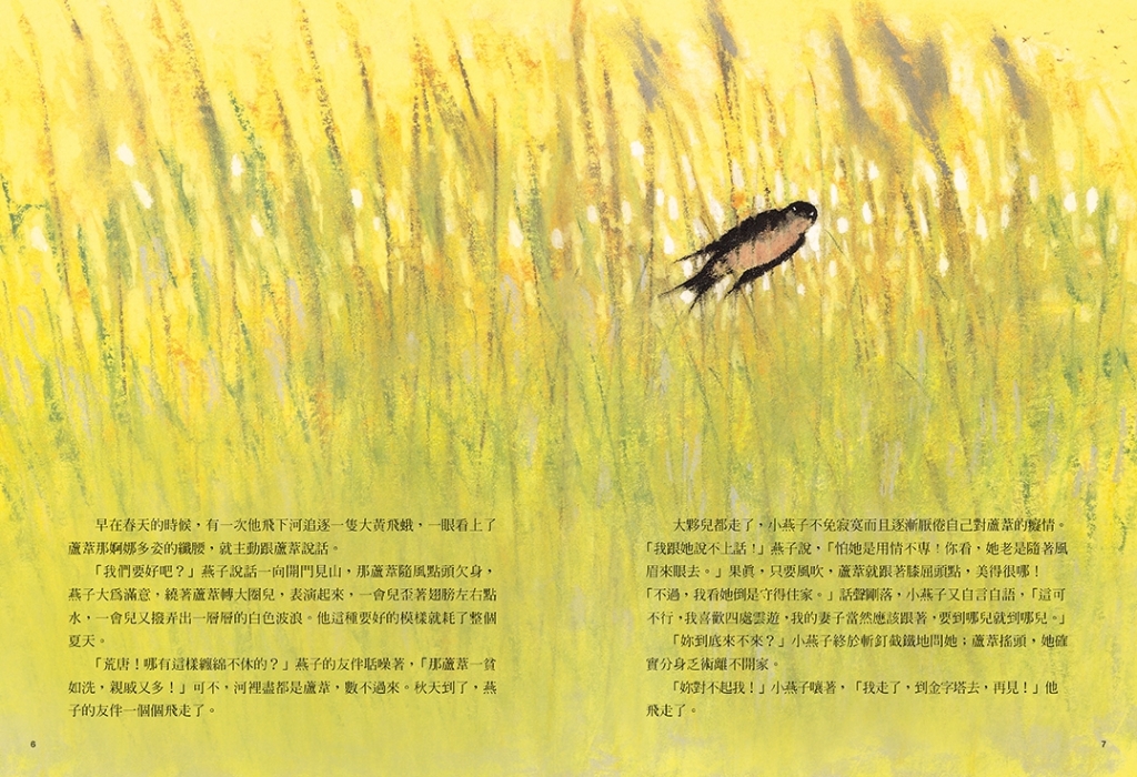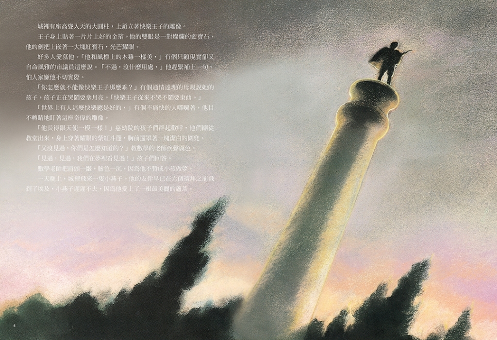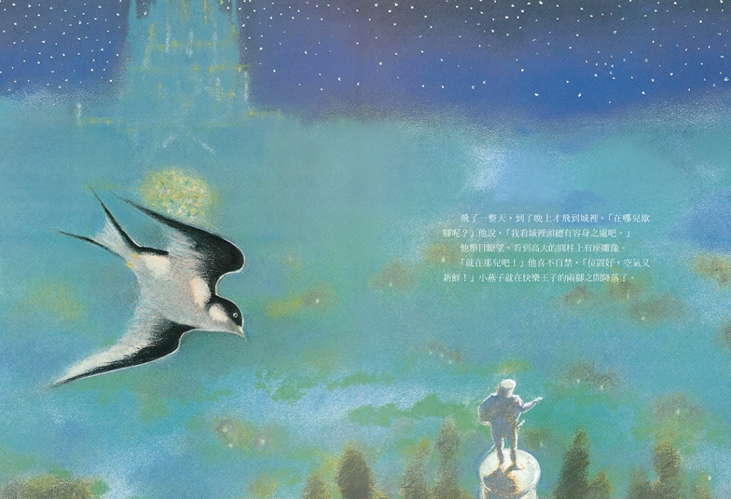 第一次聽見《快樂王子》的故事是在我七歲的時候,父親剛從美國留學回來不久,他將這個故事帶回來給我,當時聽了十分感動,所以對這個故事留下很深刻的印象。不過因為年紀漸長,對故事的記憶也逐漸模糊,直到後來選擇以插畫為職業時,有一回偶然問起出版社的編輯,他們是否知道一個關於王子和一隻燕子的故事,結果沒有人記得這個故事,因此我一度以為這個故事是父親自己憑空杜撰的。我父親非常喜歡說故事,孩提時代,當我們傍晚在屋頂乘涼的時候,父親就經常會說故事給我們聽,他只要一說起故事就會天馬行空,口沫橫飛,一直說到我們昏昏欲睡為止,如果故事還沒結束,隔天再繼續。所以後來我也以為「快樂王子」這個故事是他自己瞎編的。