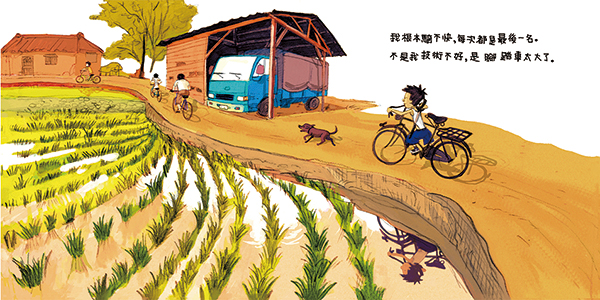 作者迫不及待的,在一般圖畫書只印一片單一顏色的封面裡頁,就開始說起故事,還幽默地借由可愛的神燈說出主角心裡的願望,頗能引發讀者對故事的好奇。一部腳踏車對某些人而言可能只是一種玩具或運動器材,但對本書主角來說,不但是交通工具,也是交朋友的媒介,更是好大好難的夢想。而這樣的夢,使他養成比別人厲害的生活能耐和善解人意的珍貴情操。這樣的故事情節,使這本書顯出不凡的魅力,並能引發讀者的深思。