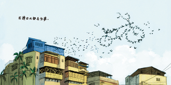 作者以介於素寫和卡通的造形,描繪平時就在我們身邊的景物,如亂七八糟的電線、採光很差的傳統市場等。當它們都變成圖畫呈現在我們眼前時,竟然會特別覺得親切,而感受到這塊土地的美感與生命力!原來這是我們生活的舞台。