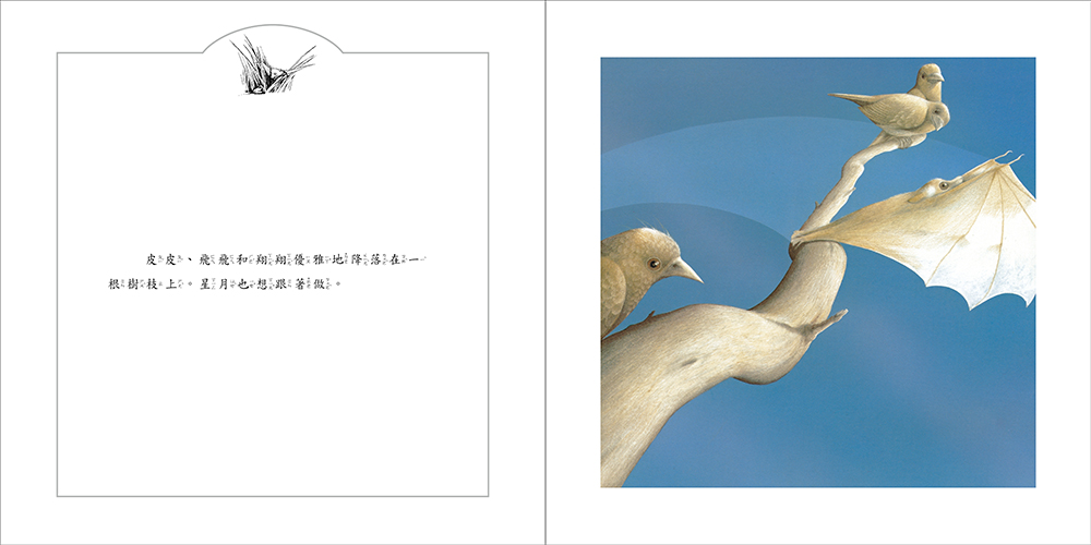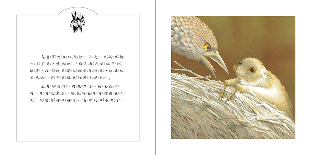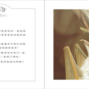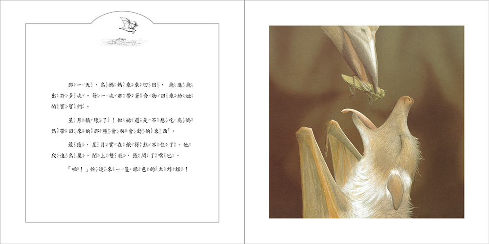 文字溫馨感人,字裡行間散發稚子之親情摯愛,增添了本書的可讀性和資訊性。插畫筆觸細緻,角色造型逼真可愛,畫者將蝙蝠和鳥的生態描繪得維妙維肖,帶給讀者視覺和認知上非常的撼動。