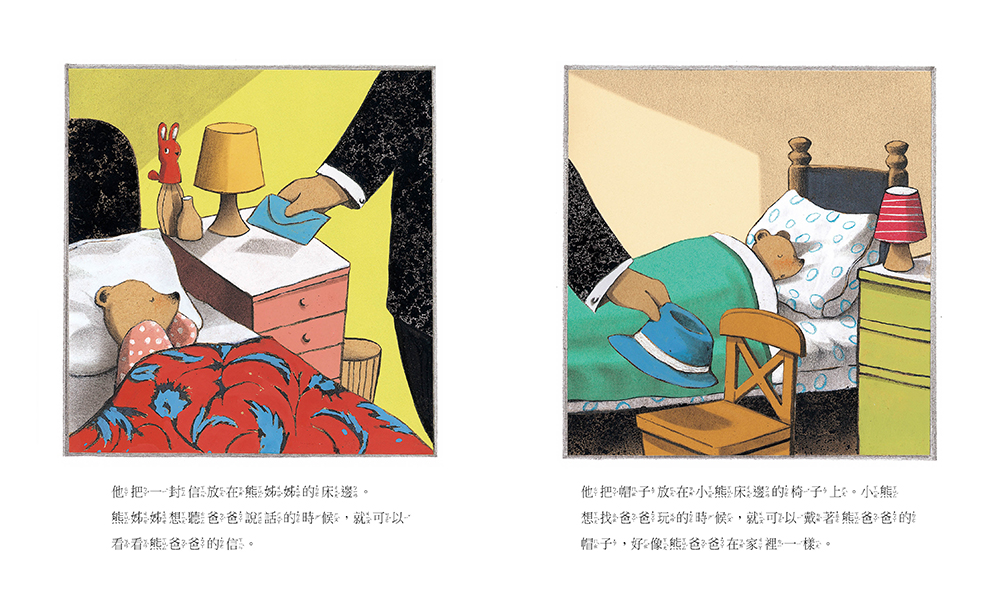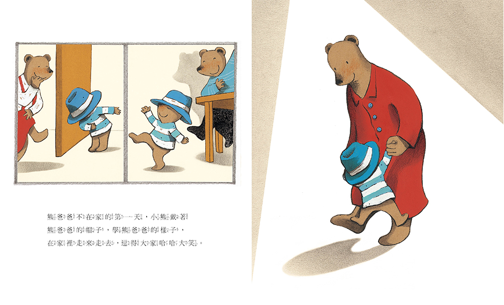 本書反映了現代家庭所面臨的生活轉變,因為工作的關係,熊爸爸必須隻身前往外地工作半年,這是一家人第一次分開這麼久,他們該如何平撫分離的焦慮,又該如何表達對彼此的思念之情呢? 熊爸爸貼心的為孩子們留下合照、書信和帽子,滿足孩子們的不同需求,讓家人在自己離家後也能安心的生活著。但是獨自離鄉背井的熊爸爸,在面對陌生的工作環境與人事物,又該如何自處呢?幸好家人早就精心準備了愛心小禮物,跨越時空傳遞關愛,稍稍排解熊爸爸心中的寂寞與思念。