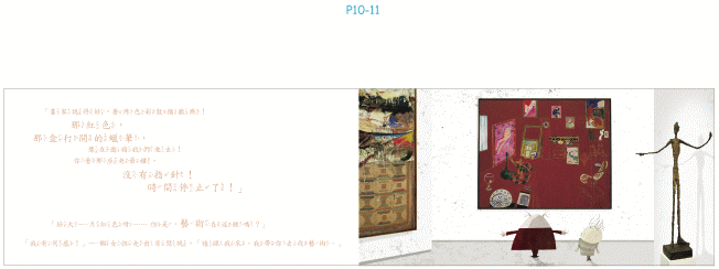 本圖畫書以紐約現代美術館為背景,帶領讀者見識了各色各樣的藝術形式,但是都不是小男孩要找的藝術,原來小男孩在街口等的藝術是另一個男孩,他的名字叫藝術。