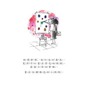 作者創造了一個活潑、調皮的角色,圖畫課結束了,葳葳的圖畫紙還是空白的,老師耐心的引導,葳葳覺得「真─好─笑!」她說:「我就是不會畫圖呀!」,老師依然耐心的引導她:「妳就畫幾筆吧!」葳葳用力在紙上點了一下,然後老師輕聲的說:「請簽名。」,一星期後葳葳走近美術教室,發現她畫的小點點被配上金色的畫框掛著,她想:「嗯!我可以畫的更好!」,葳葳畫個不停,黃色的點、綠色的點、紅色的點、藍色的點,畫出各種顏色的、大大小小的點,幾個星期後,葳葳在學校開了一個非常轟動的畫展。