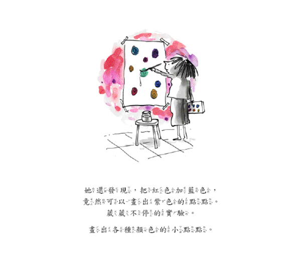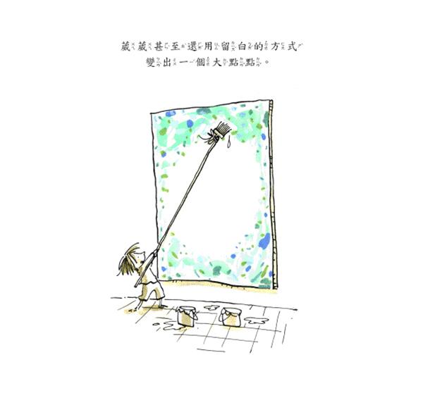 我常有機會參加兒童繪畫比賽的評審,通常分低、中、高年級來評,評完了,評審們都有共同的見解,越高年級創造力越少,直感力越弱。《點》的作者彼得‧雷諾茲說:「我常常問教室裡的孩子們,有誰愛畫圖?幼稚園和小學一年級的小朋友幾乎都會舉手。但到了四、五年級,大部份的人都不舉手了,或是都指向班上某一位『小畫家』。看到孩子們的創造活力逐年下降,最後全部消失,實在令人惋惜!」他對美術教育的狀況亦有相同的看法。